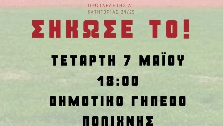 Την Τετάρτη 7 Μαΐου στο δημοτικό γήπεδο Πολίχνης στις 6μμ θα πραγματοποιηθεί η απονομή του πρωταθλήματος στον Φοίνικα Πολίχνης καθώς βγήκε πρώτος στον 2ο όμιλο της Α’ Κατηγορίας της ΕΠΣ Μακεδονίας.