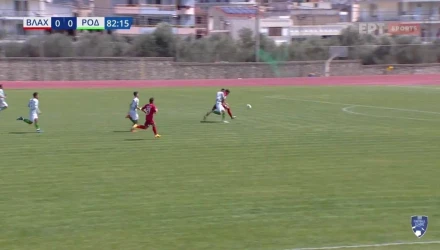 Ο αμυνόμενος της Ρόδου, βασίλης Μπαξεβάνος, έχασε το μαρκάρισμα του αντιπάλου του μέτά από κακό υπολογισμό της μπάλας και πήρε... αγκαλιά τον επιτιθέμενο του Αστέρα Βλαχιώτη για να ανακόψει το πιθανό γκολ.