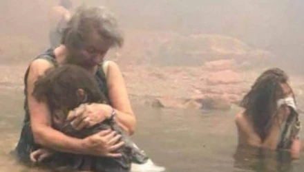 Στη φωτογραφία που βλέπετε μια γυναίκα κρατά σφιχτά στην αγκαλιά της ένα παιδί, στην προσπάθειά της να το προστατεύσει από τους καπνούς που πνίγουν τους δεκάδες εγκλωβισμένους, οι οποίο βρήκαν καταφύγιο στη θάλασσα.