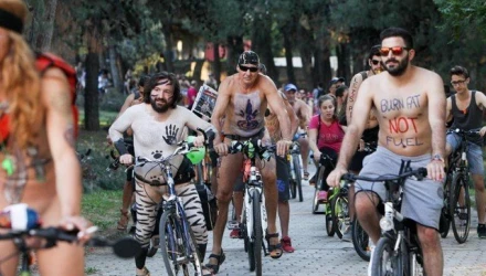Δεκάδες άτομα όλων των ηλικιών έβγαλαν τα ρούχα τους, ζωγράφισαν τα σώματά τους και με... ορθοπεταλιές στέλνουν ένα ηχηρό μήνυμα για τη χρήση του ποδηλάτου ως μέσου μετακίνησης και της βιώσιμης κινητικότητας ενάντια στην κουλτούρα του αυτοκινήτου και της ρύπανσης που δημιουργεί.