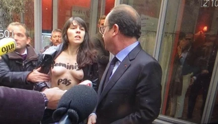 Δύο από τα μέλη της φεμινιστικής οργάνωσης, λοιπόν, πλησίασαν τον Ολάντ αιφνιδιάζοντας τον ίδιο αλλά και τους άνδρες ασφαλείας του.