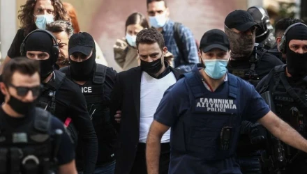 Ο Μπάμπης Αναγνωστόπουλος πέρασε το κατώφλι των δικαστηρίων δεμένος πισθάγκωνα με χειροπέδες και φορώντας αλεξίσφαιρο γιλέκο.