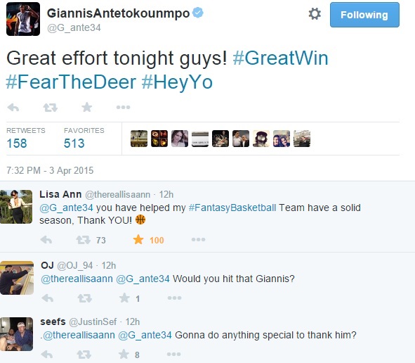 Ο Έλληνας παίκτης συνεχάρη μέσω twitter τους συμπαίκτες του, γεγονός που δεν προκαλεί έκπληξη. Αυτό που ξάφνιασε ήταν το ότι ανάμεσα σε αυτούς που έσπευσαν να σχολιάσουν ήταν κι η πρώην πορνοστάρ, Λίζα Ανν. Συγκεκριμένα, η Ανν ευχαρίστησε τον Γιάννη, καθώς βοήθησε την ομάδα της στο Fantasy.