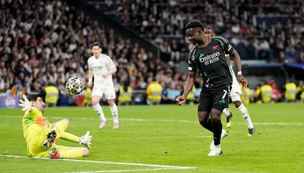 Με τη συμπλήρωση 65 λεπτών αγώνα στο «Σαντιάγκο Μπερναμπέου» η Άρσεναλ κατάφερε να ανοίξει το σκορ, όταν ο Μερίνο έβγαλε μαγική κάθετη πάσα στον Σακά, με τον Άγγλο να τσιμπάει τη μπάλα προ του εξερχόμενου Κουρτουά γράφοντας το 0-1.