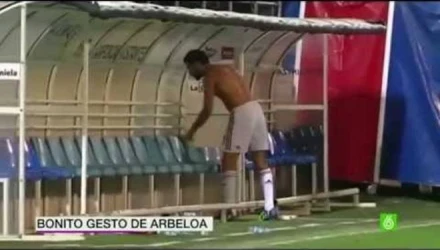 Στο δρόμο προς τη φυσούνα για τα αποδυτήρια ο Αρμπελόα αποφάσισε να μείνει γυμνός από τη μέση και πάνω βγάζοντας τη φανέλα του για να την εκτοξεύσει προς την εξέδρα.