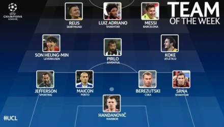 Η καλύτερη 11άδα της αγωνιστικής: Χαντάνοβιτς (Μάριμπορ)-Σρνα (Σαχτάρ Ντόνετσκ), Μπερεζούτσκι (ΤΣΣΚΑ Μόσχας), Μαϊκόν (Πόρτο), Τζέφερσον (Σπόρτινγκ Λισαβόνας)-Κόκε (Ατλέτικο Μαδρίτης), Πίρλο (Γιουβέντους), Σον (Μπάγερ Λεβερκούζεν)-Μέσι (Μπαρτσελόνα), Αντριάνο (Σαχτάρ Ντόνετσκ), Ρόις (Ντόρμουντ).