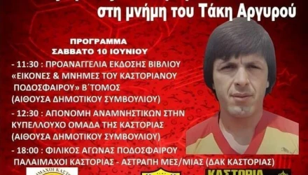Απονομές αναμνηστικών στους ποδοσφαιριστές της Κυπελλούχου Ελλάδος 1980 ΚΑΣΤΟΡΙΑΣ θα γίνουν στις 12.30 και στις 18:00 στο Δ.Α.Κ. ΚΑΣΤΟΡΙΑΣ φιλικός αγώνας στη μνήμη του Τάκη Αργυρού μεταξύ των παλαιμάχων ΚΑΣΤΟΡΙΑΣ- ΑΣΤΡΑΠΗΣ ΜΕΣΟΠΟΤΑΜΊΑΣ.