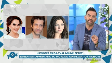 Η κόντρα ανάμεσα στα κανάλια MEGA και ΣΚΑΪ είναι τόσο έντονη και ικανή να αφήσει τις Δέσποινα Βανδή και Καίτη Γαρμπή εκτός από το μουσικό αφιέρωμα του Φοίβου. Το μεγάλο κανάλι άσκησε βέτο και δεν επιτρέπει στη Δέσποινα Βανδή να βρεθεί στο εν λόγω αφιέρωμα καθώς φιλοξενεί και εκείνο μια ανάλογου τύπου εκπομπή κάθε Σάββατο.