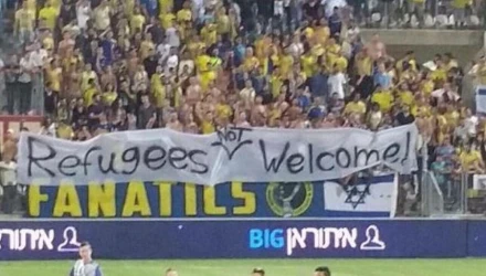 Πανό κατά των προσφύγων σήκωσαν οι οπαδοί της Μακάμπι Τελ Αβίβ στο αποψινό παιχνίδι της ομάδας τους με τη Χαποέλ Κιριάτ Σμόνα.