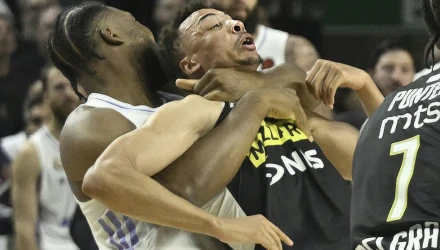 Former Boston Celtic Guerschon Yabusele slams Dante Exum to the ground during a brawl between Real Madrid and Partizan!