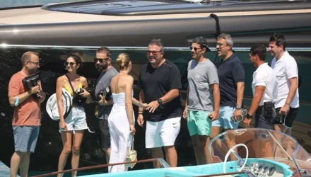 Όταν ολοκληρώθηκε η δουλειά της, με το σκάφος βγήκε στη στεριά και εκεί την υποδέχτηκε ο Αντώνης Ρέμος, γνώριμος της Μυκόνου αφού διαθέτει εκεί εξοχική κατοικία.