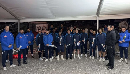 Οι παίκτες και το τεχνικό επιτελείο του Γηραιού στην επιστροφή από την Καρδίτσα, άφησαν για λίγο στην άκρη τους πανηγυρισμούς για την άνοδο στη μεγάλη κατηγορία μετά από εννέα χρόνια και τίμησαν τη μνήμη των θυμάτων των Τεμπών.