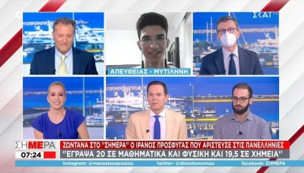 Στην εκπομπή "Σήμερα" μίλησε ο Ιρανός πρόσφυγας που αρίστευσε στις πανελλήνιες. Ο νεαρός μαθητής αναφέρθηκε στις προσπάθειες που έκανε για να πετύχει το στόχο του και τους βαθμούς που έγραψε.