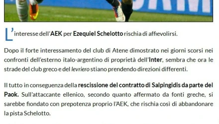 Για ενδιαφέρον της ΑΕΚ για τον Δημήτρη Σαλπιγγίδη κάνει λόγο ιταλική ιστοσελίδα που ασχολείται με το ρεπορτάζ της Ίντερ. Συγκεκριμένα, στην ιστοσελίδα passioneinter.com στο θέμα του Εζέκιελ Σκελότο αναφέρεται ότι η «Ένωση» κάνει πίσω για τον Αργεντίνο επιθετικό, εξαιτίας της λύσης της συνεργασίας του Σαλπιγγίδη με τον ΠΑΟΚ.