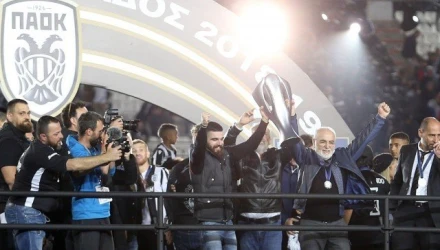 Ο μεγαλομέτοχος του ΠΑΟΚ περίμενε να κλείσει το φύλλο αγώνος, σεβόμενος την τιμωρία που του έχει επιβληθεί και παρουσιάστηκε τελευταίος από τον σπίκερ, λίγο προτού πάει προς την... κούπα.