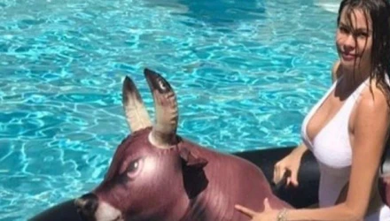 Φορώντας ένα σέξι λευκό μαγιό η Σοφία Βεργκάρα απόλαυσε το μπάνιο της σε μια πισίνα καταγράφοντας και μια τούμπα της από ένα φουσκωτό ταύρο.