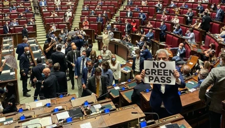 Κρατούσαν ασπρόμαυρα πλακάτ που έγραφαν “NO GREEN PASS” (Όχι Στο Πράσινο Πάσο) ψηλά στο ημικύκλιο του κοινοβουλίου. Ο καυγάς πυροδοτήθηκε από την απόφαση της προεδρίας να μην χορηγηθεί μυστική ψηφοφορία για τις ψήφους σχετικά με την προκαταρκτική απόφαση στην πρόταση αντισυνταγματικότητας που παρουσίασε το κόμμα της Τζόρτζια Μελόνι για το διάταγμα της κυβέρνησης.