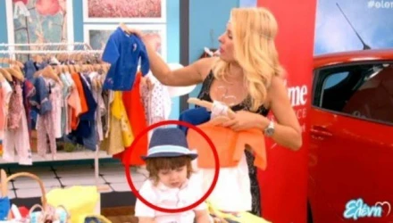 Κάποια στιγμή, η παρουσιάστρια τον ανέβασε στο τραπέζι, ενώ η ίδια παρουσίαζε τα ρούχα. Tότε ο μικρούλης άρχισε να κλείνει τα μάτια του και το κεφαλάκι του άρχισε να γέρνει... Η Ελένη Μενεγάκη ευτυχώς πρόλαβε να τον πάρει στην αγκαλιά της πριν βρεθεί κάτω από το τραπέζι...