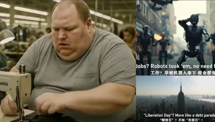 Σε ένα από τα βίντεο, εικονίζονται υπέρβαροι Αμερικανοί εργαζόμενοι σε κλωστοϋφαντουργία - κάτεργο να ράβουν ενδύματα με ραπτομηχανές, εμφανώς εξαντλημένοι, σε ένα εργασιακό τοπίο ως αποτέλεσμα των σαρωτικών δασμών του Τραμπ.