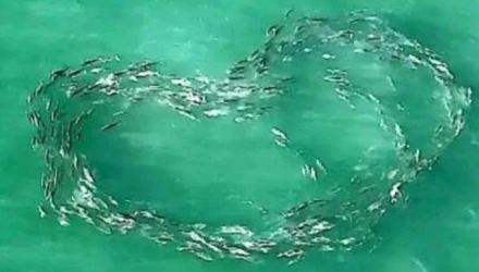 Eκπληκτικές εναέριες λήψεις αποτύπωσαν τη στιγμή που ένα κοπάδι ψαριών κινείται μέσα στη θάλασσα σε σχήμα τέλειας καρδιάς.