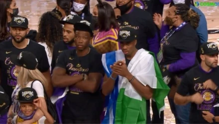 Σε αυτή τη μεγάλη στιγμή ο Κώστας Αντετοκούνμπο επέλεξε κατά τη διάρκεια της απονομής να κρατά τις σημαίες και της Ελλάδας και της Νιγηρίας. Η απονομή στον Κώστα Αντετοκούνμπο που πανηγύρισε έξαλλα με τους υπόλοιπους παίκτες των Λέικερς την κατάκτηση του πρωταθλήματος έδωσε την αφορμή στον Τζαβέιλ Μαγκί να τρολάρει τον Γιάννη Αντετοκούνμπο.