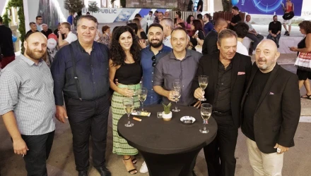 * O οικοδεσπότης και πρόεδρος του ομίλου Metromedia, Παύλος Ανδρώνης μαζί με τους (από αριστερά) Ιορδάνη Γκαμπεντάβα (Mynews.gr), Εμιλυ Ανδρώνη, Τιγκράν Χακομπιάν, Κωνσταντίνο Ξεφτέρη (Goldmall.gr), Δήμο Βαρδάκη (Metropolis 95,5) και Βασίλη Μάστορα (Metrosport)