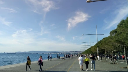 Πλήθος κόσμου συγκεντρώθηκε στην Νέα Παραλία της Θεσσαλονίκης. Όταν ο αέρας σταμάτησε ύστερα από αρκετές ημέρες, οι κάτοικοι της πόλης αποφάσισαν να μην χάσουν την ευκαιρία και να επισκεφθούν την Παραλία για να απολαύσουν τον ήλιο και να κάνουν τη βόλτα τους.