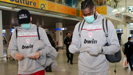 Ορισμένα μέλη της αποστολής του Ολυμπιακού εμφανίστηκαν με μάσκες στο αεροδρόμιο «Ελευθέριος Βενιζέλος» κατά την αναχώρησή της για Βερολίνο.