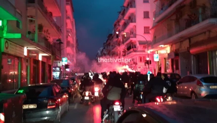 Κρατώντας πυρσούς και φωνάζοντας συνθήματα, οι φίλοι του Δικεφάλου μετακινήθηκαν προς το κέντρο της πόλης μέσω της οδού Ακροπόλεως και μετά από μια μικρή στάση στην Αγίου Δημητρίου συνέχισαν την μοτοπορεία, η οποία κατέληξε στο γήπεδο της Τούμπας.