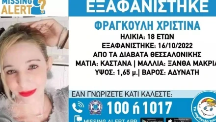 Την Κυριακή 16/10/2022 εξαφανίστηκε από την περιοχή των Διαβατών στη Θεσσαλονίκη, η Φραγκούλη Χριστίνα, 18 ετών. Το «Χαμόγελο του Παιδιού» προχώρησε στη δημοσιοποίηση των στοιχείων της ενήλικης, κατόπιν αιτήματος της οικογένειάς της, καθώς ενδέχεται να συντρέχουν λόγοι οι οποίοι θέτουν τη ζωή της σε κίνδυνο.