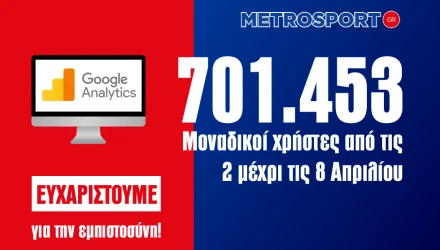 Σύμφωνα με την google analytics που είναι η πιο έγκυρη μέτρηση που υπάρχει στο διαδίκτυο, το metrosport.gr κατά το διάστημα από 2 ως 8 Απριλίου έσπασε κάθε ρεκόρ του.