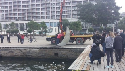 Δύτες της Ελληνικής Ομάδας Διάσωσης βούτηξαν το πρωί στα νερά του Θερμαϊκού Κόλπου, μπροστά από το ξενοδοχείο "Μακεδονία Παλλάς", για να ανασύρουν το γλυπτό "Φεγγάρι στην Ακτή", του καλλιτέχνη Παύλου Βασιλειάδη.