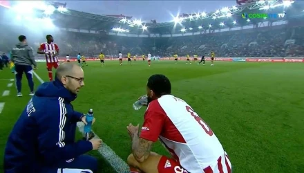 Ο ίδιος πήγε κατευθείαν να καθίσει, να φάει κάτι και να πιει νερό, ενώ το ίδιο έκαναν και οι παίκτες Ολυμπιακού και ΑΕΚ μπροστά από τους δύο πάγκους.