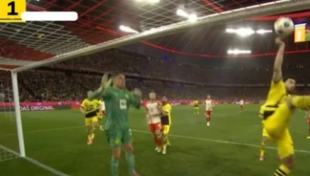 Εξετάστηκε και το VAR και δεν δόθηκε πέναλτι στην Μπάγερν, παρότι η μπάλα χτυπά στο χέρι του αμυντικού της Ντόρτμουντ.