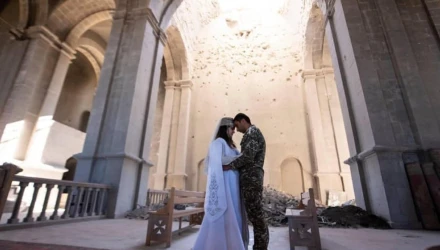 Μέσα στον κατεστραμμένο ναό η τελετή έγινε κανονικά παρουσία λιγοστών συγγενών και φίλων και οι φωτογραφίες κάνουν το γύρο του διαδικτύου προκαλώντας συγκίνηση αλλά και αισθήματα ομοψυχίας και δύναμης στους Αρμενίους.