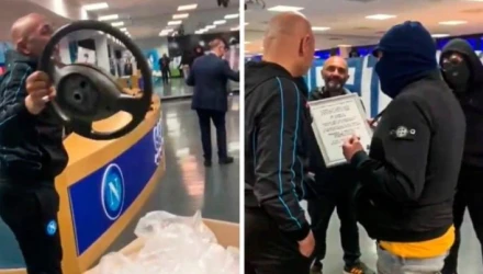 As a reward for winning the title, Napoli ultras gave Luciano Spalletti the steering wheel and CD's they stole from his beloved Fiat Panda in 2021 when they were protesting him. 😂🚗