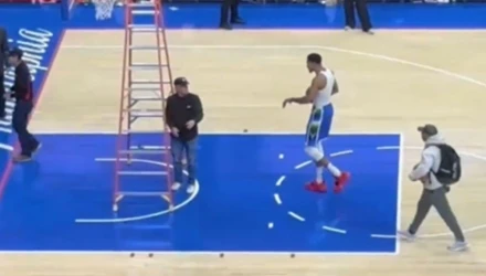 Ο Γιάννης πήγε στα αποδυτήρια και επέστρεψε με δύο δικές του μπάλες. Τότε οι εργάτες των Σίξερς πήγαν στην μπασκέτα που εκτελούσε βολές για να αφαιρέσουν τις κάμερες, με τον Γιάννη να τους ζητάει να το κάνουν αργότερα και αυτοί να αρνούνται, κάτι που έφερε τον εκνευρισμό του και την κίνησή του να πετάξει την σκάλα στο παρκέ.