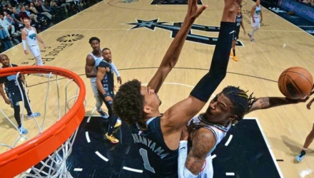 Ο άσος των Γκρίζλις σε μία προσπάθειά του και βλέποντας ότι έχει χώρο μπροστά του πήρε φόρα και κάρφωσε εντυπωσιακά μπροστά στον ύψους 2.21 μ. Γουεμπανιάμα.