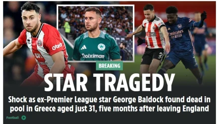 «Ο Τζορτζ Μπάλντοκ πέθανε σε ηλικία 31 ετών, καθώς ο πρώην σταρ της Σέφιλντ Γιουνάιτεντ βρέθηκε νεκρός σε πισίνα», επισημαίνεται στο ρεπορτάζ της Mirror που προσθέτει επίσης. «Πολλά μέσα στην Ελλάδα μετέδωσαν τη συγκλονιστική είδηση, με αφιερώματα για τον πρώην σταρ της Premier League. Φέρεται ότι εκφράστηκαν ανησυχίες, όταν η σύζυγος του δεν μπόρεσε να επικοινωνήσει μαζί του μετά από αρκετές ώρες χωρίς απάντηση».