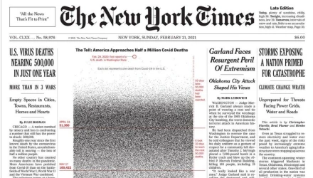 Η εμβληματική εφημερίδα της Νέας Υόρκης, επέλεξε να τυπώσει στην πρώτη της σελίδα ένα γράφημα για να εικονογραφήσει τα 500.000 θύματα της πανδημίας.