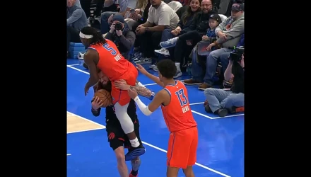 Ένα διαφορετικό πλάνο καταγράφηκε την Κυριακή (25/1), κατά τη διάρκεια της αναμέτρησης των Oklahoma City Thunder με τους Toronto Raptors, όταν ο Σάντρο Μαμουκελασβίλι σήκωσε στις πλάτες του παίκτη της αντίπαλης ομάδας.