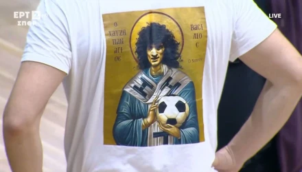 Μέσα στο πανηγυρικό κλίμα, την παράσταση έκλεψε και ένας φίλος του Ηρακλή με την ιδιαίτερη εμφάνισή του, ο οποίος επέλεξε να φορέσει ένα ευφάνταστο μπλουζάκι που απεικόνιζε τον θρυλικό Βασίλη Χατζηπαναγή ως… Άγιο, σε μια συμβολική αναφορά στον άνθρωπο που λατρεύτηκε όσο λίγοι από τον κόσμο της ομάδας.