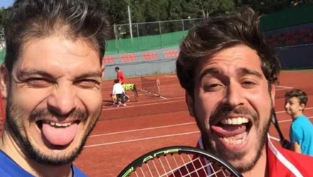 Ο χρυσός σκόρερ της Εθνικής μας ομάδας στον άθλο της Πορτογαλίας ξεχνιέται και χαλαρώνει, κρατώντας μια ρακέτα στο χέρι.