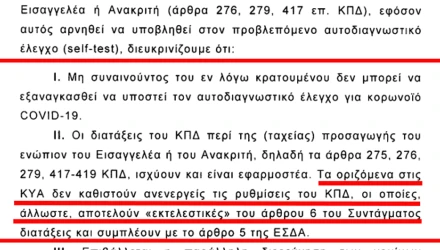Αλλά αν για έναν συλληφθέντα η κρατούμενο, είναι δικαίωμα του αναφαίρετο να μην εξαναγκαστεί σε σελφ τεστ, που θεωρείτε Ιατρική Πράξη, προστατευόμενος από τα άρθρα του ΚΠΔ, και ΟΤΙ μια Κοινή Υπουργική Απόφαση, δε μπορεί να καταργήσει νόμους που απορρέουν από τα άρθρα του συντάγματος (άρθρο 6) που αφορά τις διαδικασίες σύλληψης αλλά που είναι συνεφαρμόζεται σε συνδυασμό με το άρθρο 5 και 7 του συντάγματος.