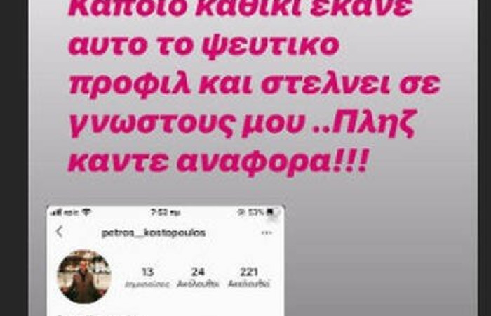 Στο μεταξύ, όμως και επειδή λόγω αργιών του Πάσχα, ο Πέτρος Κωστόπουλος δεν θα καταφέρει να καταθέσει μήνυση κατά αγνώστων πριν από την ερχόμενη Τετάρτη, έχει ήδη ενημερώσει μέσω της δικής του -αληθινής- σελίδας του στο Instagram τους φίλους του να κάνουν αναφορά στη σελίδα που χρησιμοποιεί ο ή οι δράστες με τον όνομά του.
