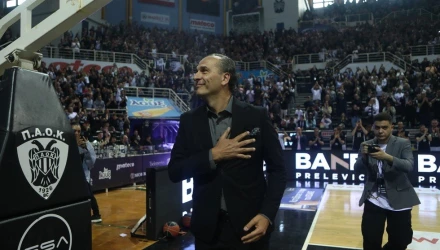 23 χρόνια αφότου άφησε τα παρκέ, είδε την ιστορική στολή του να παίρνει τη θέση της στην οροφή του PAOK Sports Arena, δίπλα στα λάβαρα των επτά τίτλων της ομάδας!