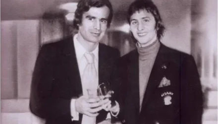 Στην φωτογραφία, οι αείμνηστοι Βουζουνεράκης και Κρόιφ, σε εκδήλωση στο περιθώριο του φιλικού ΠΑΟΚ-Αγιαξ.