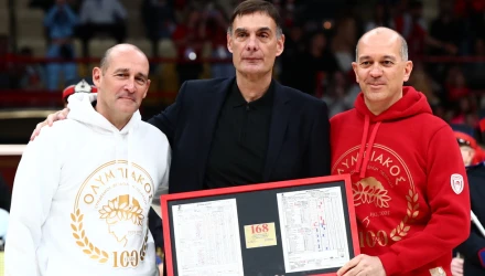 Πριν το τζάμπολ στο παιχνίδι του ΣΕΦ, ο 60χρονος κόουτς βραβεύτηκε από τους ιδιοκτήτες της ΚΑΕ Ολυμπιακός, Παναγιώτη και Γιώργο Αγγελόπουλο για να ακολουθήσουν οι δηλώσεις τους...
