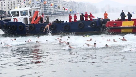 Κλήρος και λαός έφτασαν στο κολυμβητήριο με πομπή, ξεκινώντας από τον Ιερό Ναό Προφήτη Ηλία. Την πομπή συνόδευσε με τις μουσικές της η φιλαρμονική ορχήστρα του Δήμου Παύλου Μελά. Όταν εψάλη το «Εν Ιορδάνη…» ο δήμαρχος Παύλου Μελά, Δημήτρης Ασλανίδης, άφησε ένα λευκό περιστέρι. Τριάντα άτομα, ανάμεσά τους και μικροί μαθητές, βούτηξαν στην πισίνα του κολυμβητηρίου με τον 22χρονο καταδρομέα, Νίκο Χατζηαθανασίου, να πιάνει πρώτος τον Σταυρό.