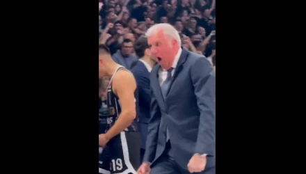 Στην κατάμεστη Stark Arena, μέσα σε μια καταπληκτική ατμόσφαιρα, ο Ζέλικο Ομπράντοβιτς ξαναέγινε… κόκκινος και μελιτζανί, αλλά πανηγυρίζοντας το κάρφωμα του Κάρλικ Τζόουνς!